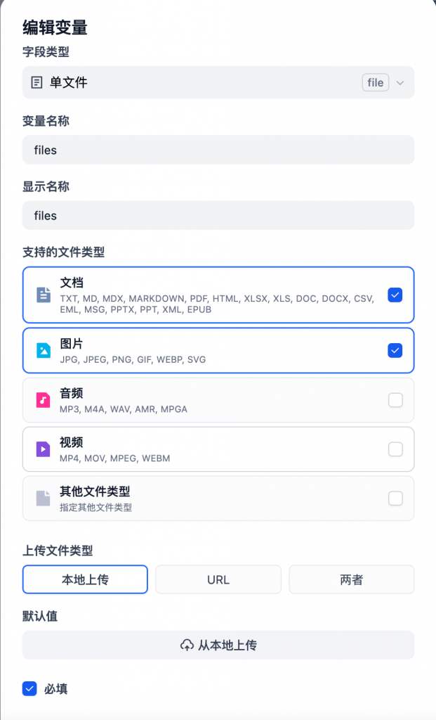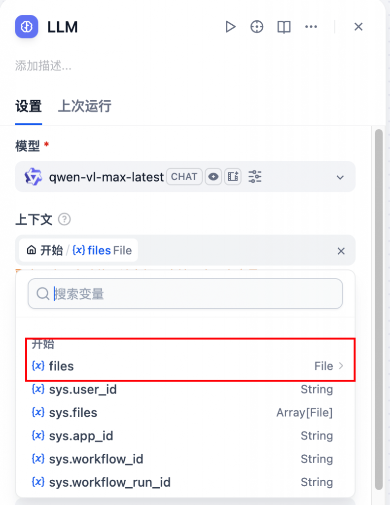 • 上下文选择:选择开始节点的输出字段【files】作为模型的上下文