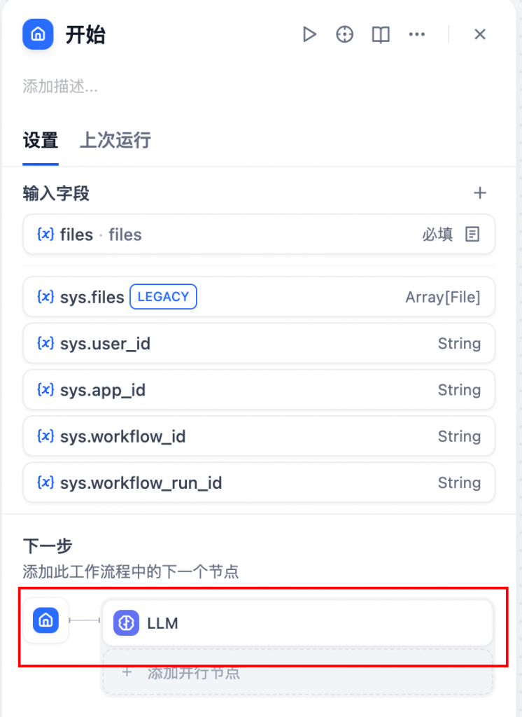 • 下一个节点:将该节点与LLM节点相连,则该节点的输出为LLM节点的输入