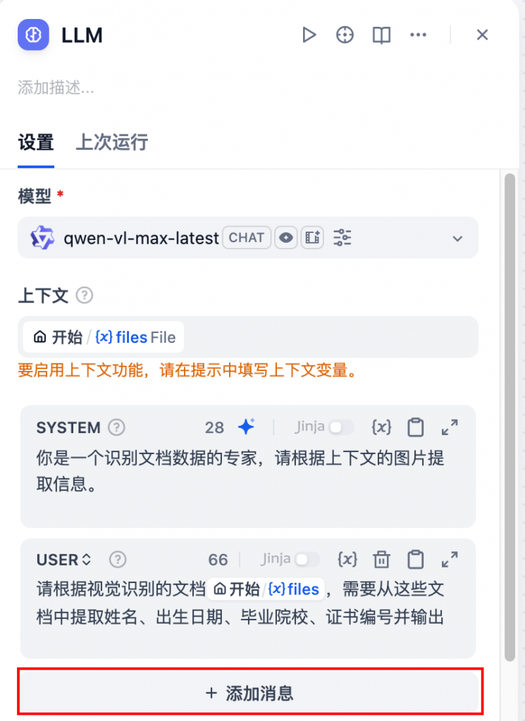 • 添加prompt:消息分为SYSTEM和USER。在user的prompt中使用了上下文的字段files,指示大模型将files中的文件提取出关键信息。