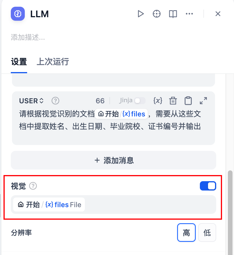 • 开启视觉:开启视觉并传入文件,LLM才会识别图片中的信息