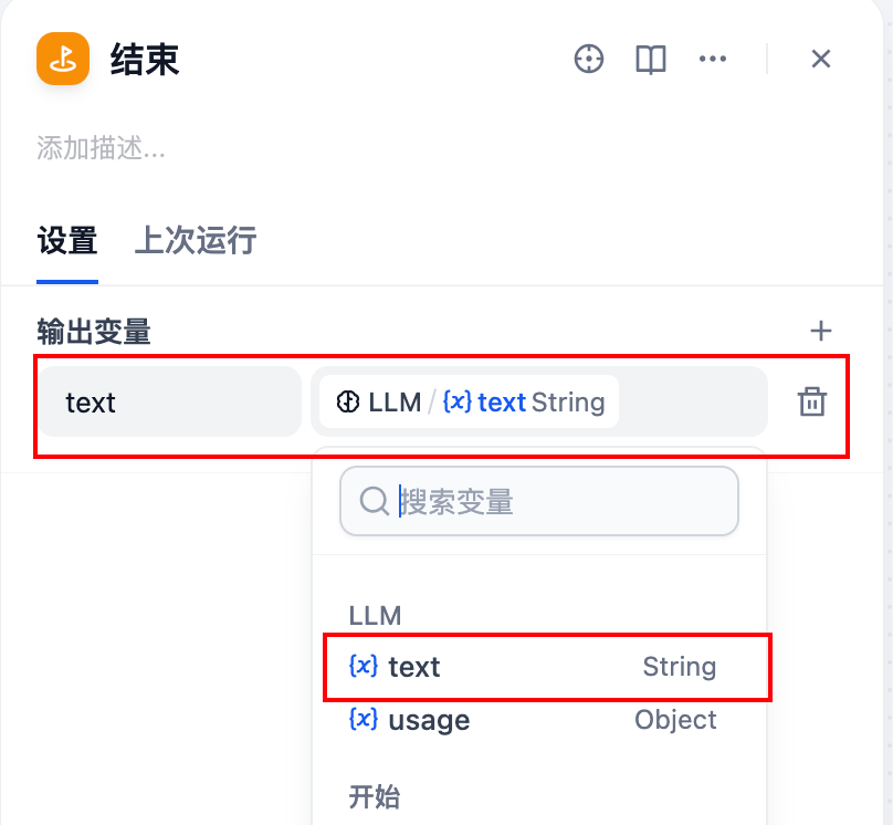 • 输出变量:将LLM的输出text作为结束节点的输出变量