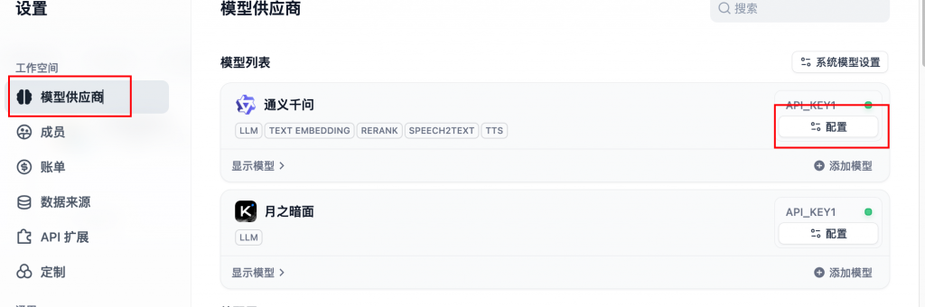 该实践使用了阿里的通义千问模型作为LLM,需要在【设置 -> 模型供应商】中按照引导进行API key配置: