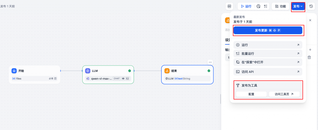 若需要用API调用工作流,则需要将该工作流发布,包括:发布为工具、发布更新操作。
